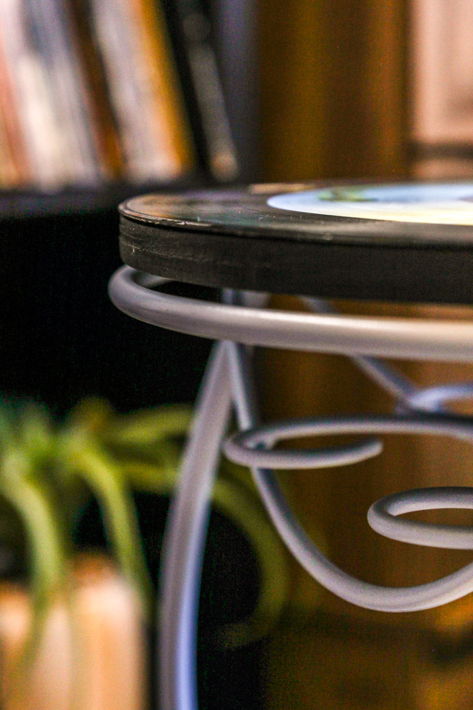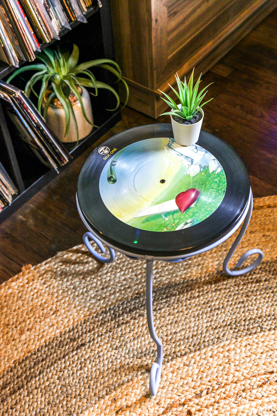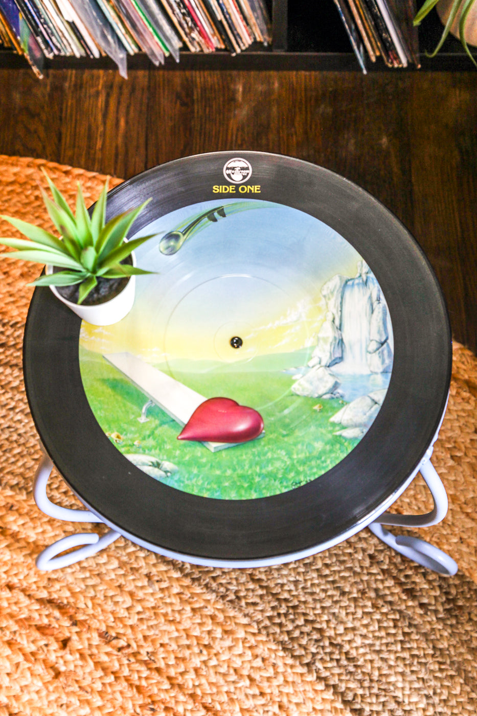 Rustic charm meets modern sophistication with this sustainably-made, steel vinyl record stand painted periwinkle blue, that features a picture disc album by Heart. This is more than just a decorative stand; it’s a statement piece for the modern music enthusiast! Display drinks, plants, & more on this functional piece of art while also reflecting your commitment to sustainability and passion for music.