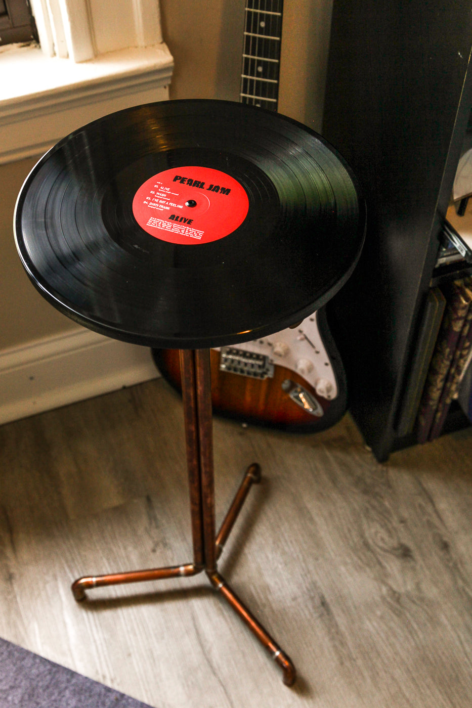 Rustic charm meets modern sophistication with this sustainably-made, copper vinyl record stand featuring an album by Pearl Jam. This is more than just a decorative stand; it’s a statement piece for the modern music enthusiast! Display drinks, plants, & more on this functional piece of art while also reflecting your commitment to sustainability and passion for music.